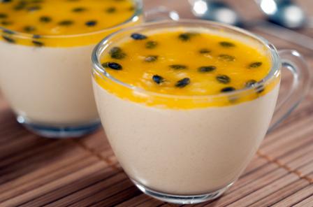– No preparo da calda, leve ao fogo médio a polpa do maracujá com sementes e o amido dissolvido na água. Mexa até engrossar. Após esfriar, adicione o adoçante;